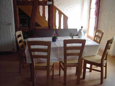 Der Wohnraum ist optisch durch Holzgebälk getrennt. Ebenfalls